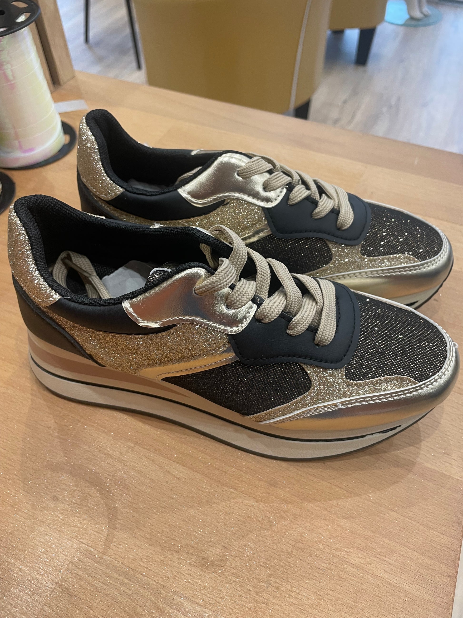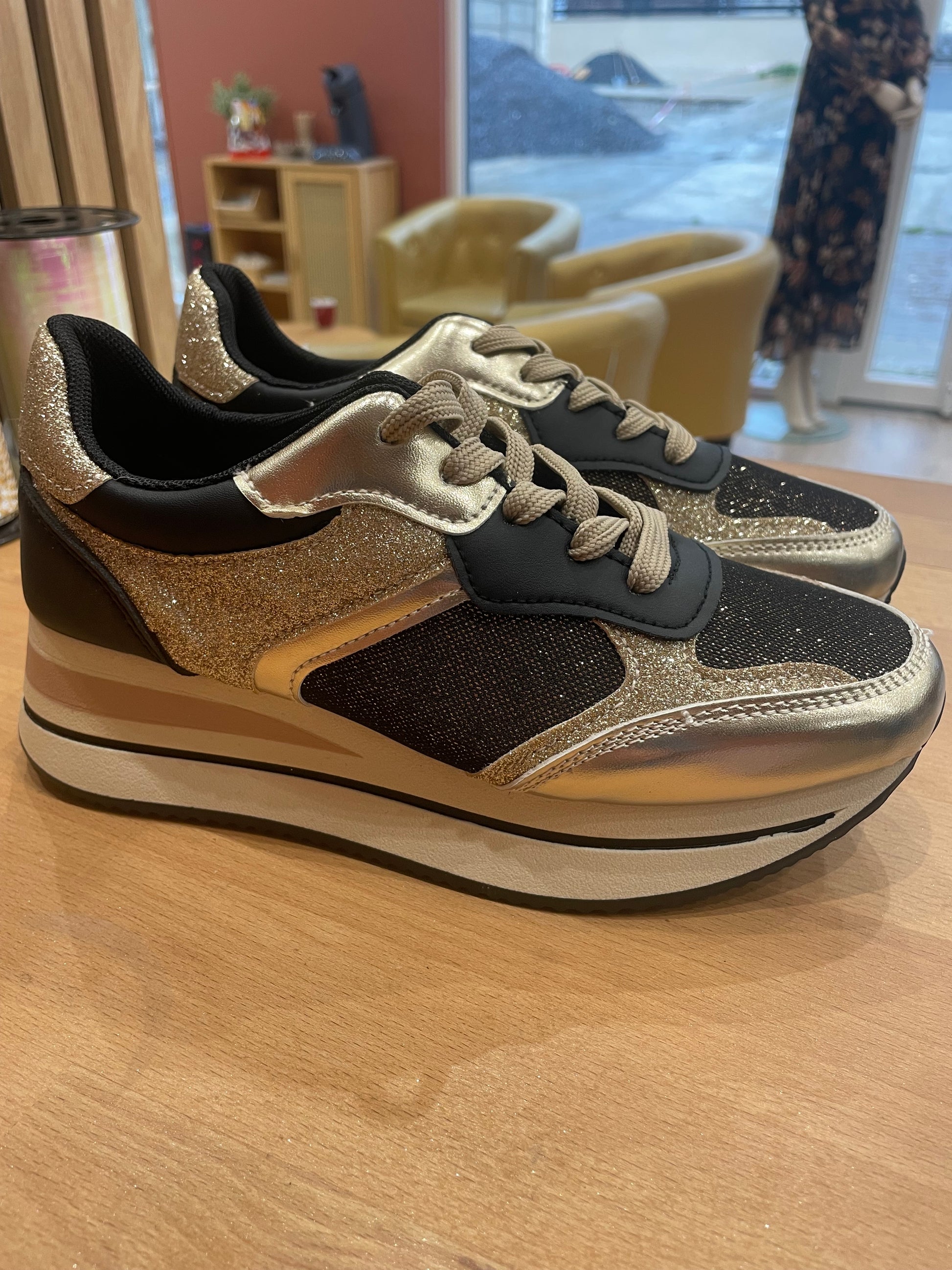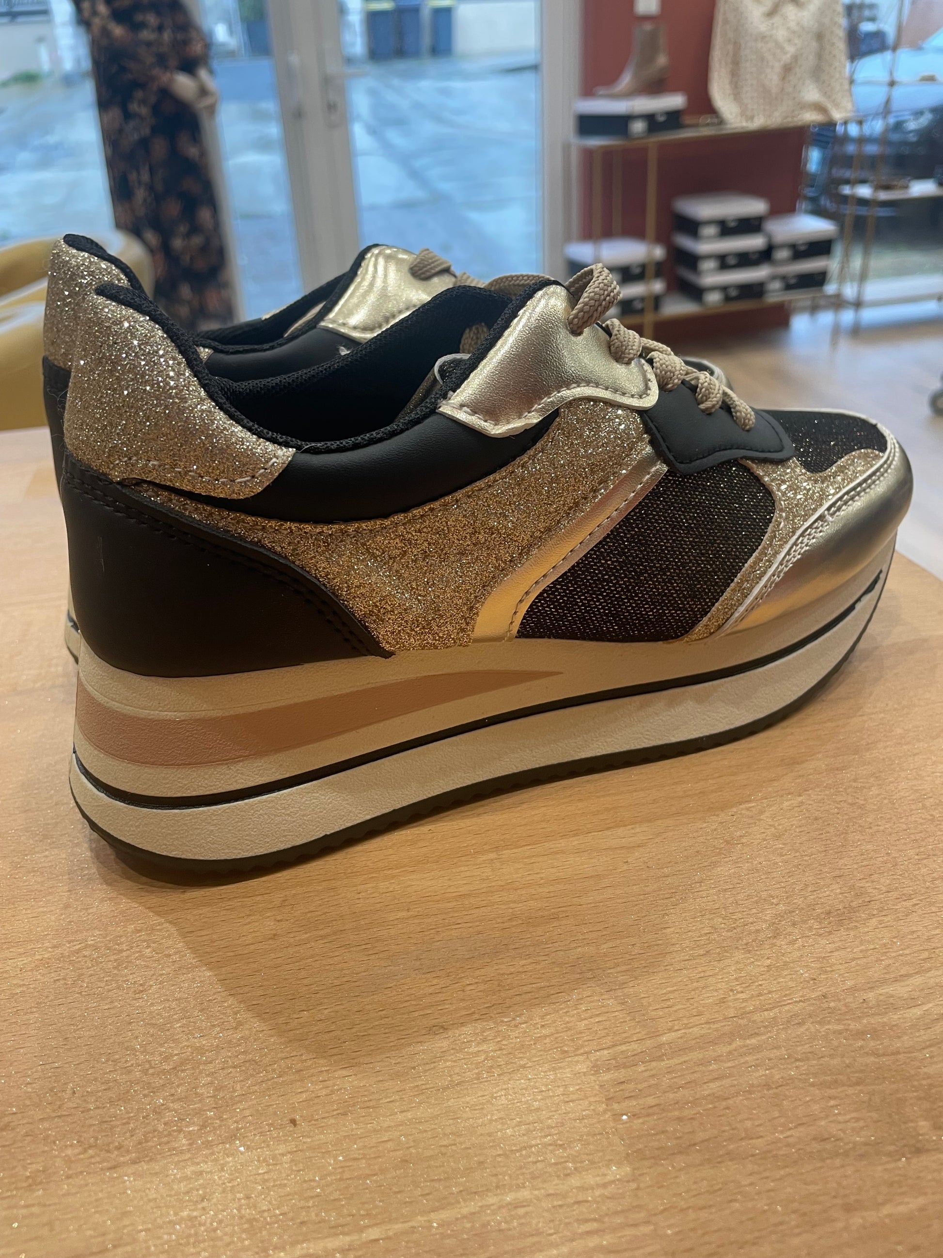Affirmez votre style avec cette paire de baskets noires et dorées au design moderne et éclatant. Alliant élégance intemporelle et touche luxueuse, ces chaussures tendance sont parfaites pour celles et ceux qui veulent briller à chaque pas.
