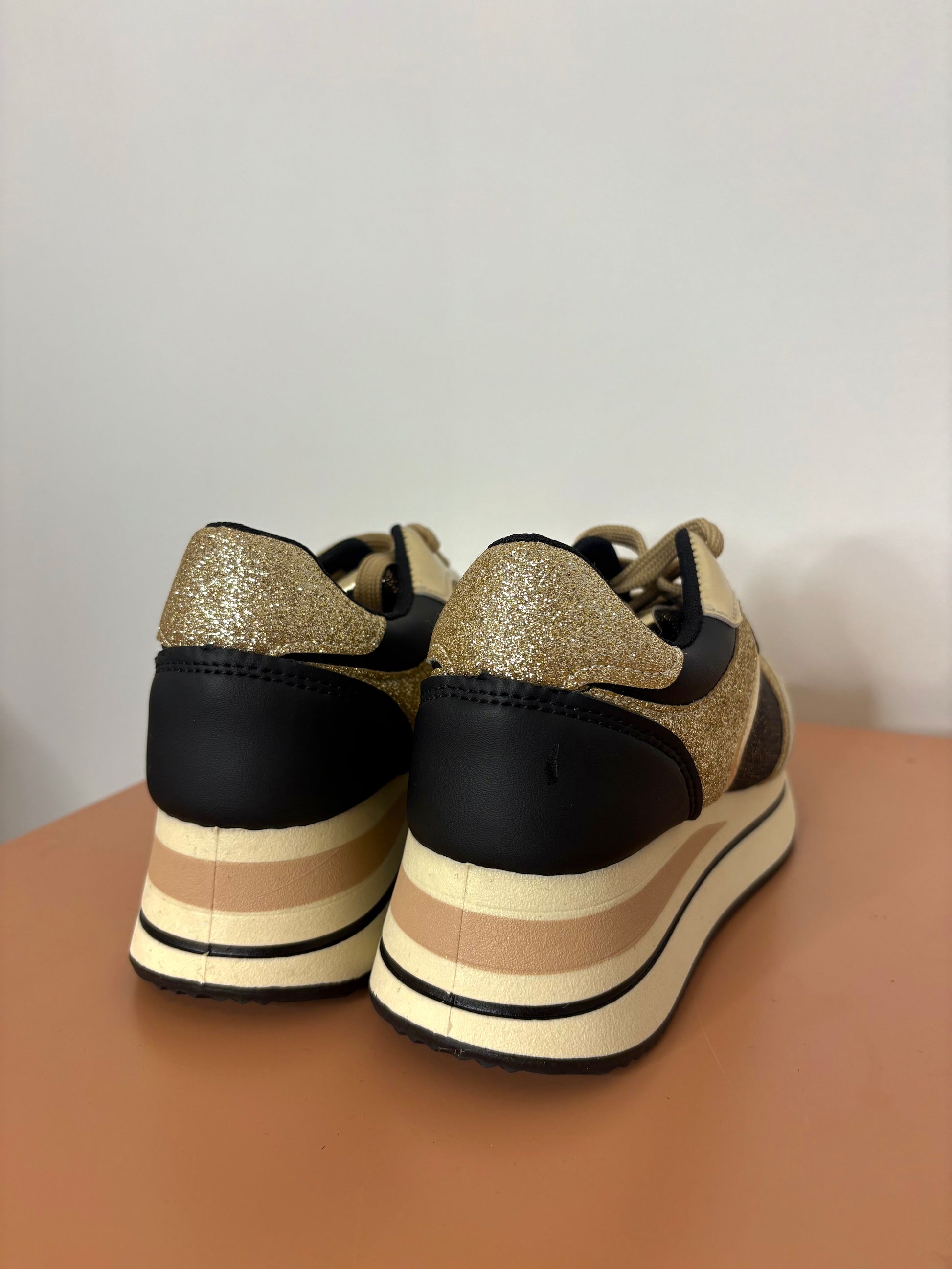 Fabriquées avec des matériaux de qualité, ces baskets offrent un confort optimal et une résistance durable. La finition noire brillante s’accorde parfaitement avec les détails dorés métallisés, apportant une allure à la fois sportive et chic.