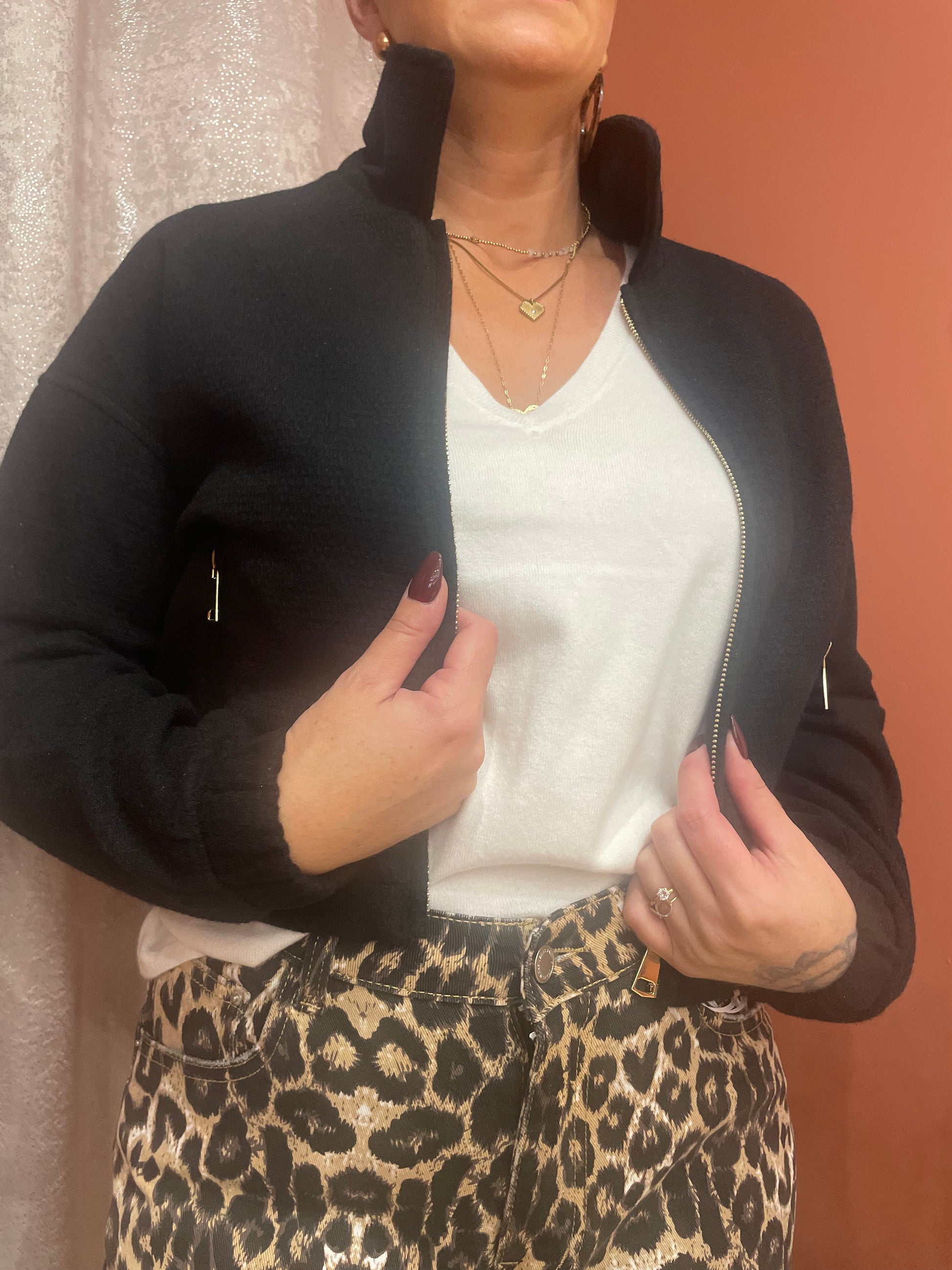 Indémodable et facile à porter, ce blouson noir à fermeture éclair est la pièce parfaite pour un look moderne et urbain. Sa coupe ajustée met en valeur la silhouette tout en offrant un confort optimal.