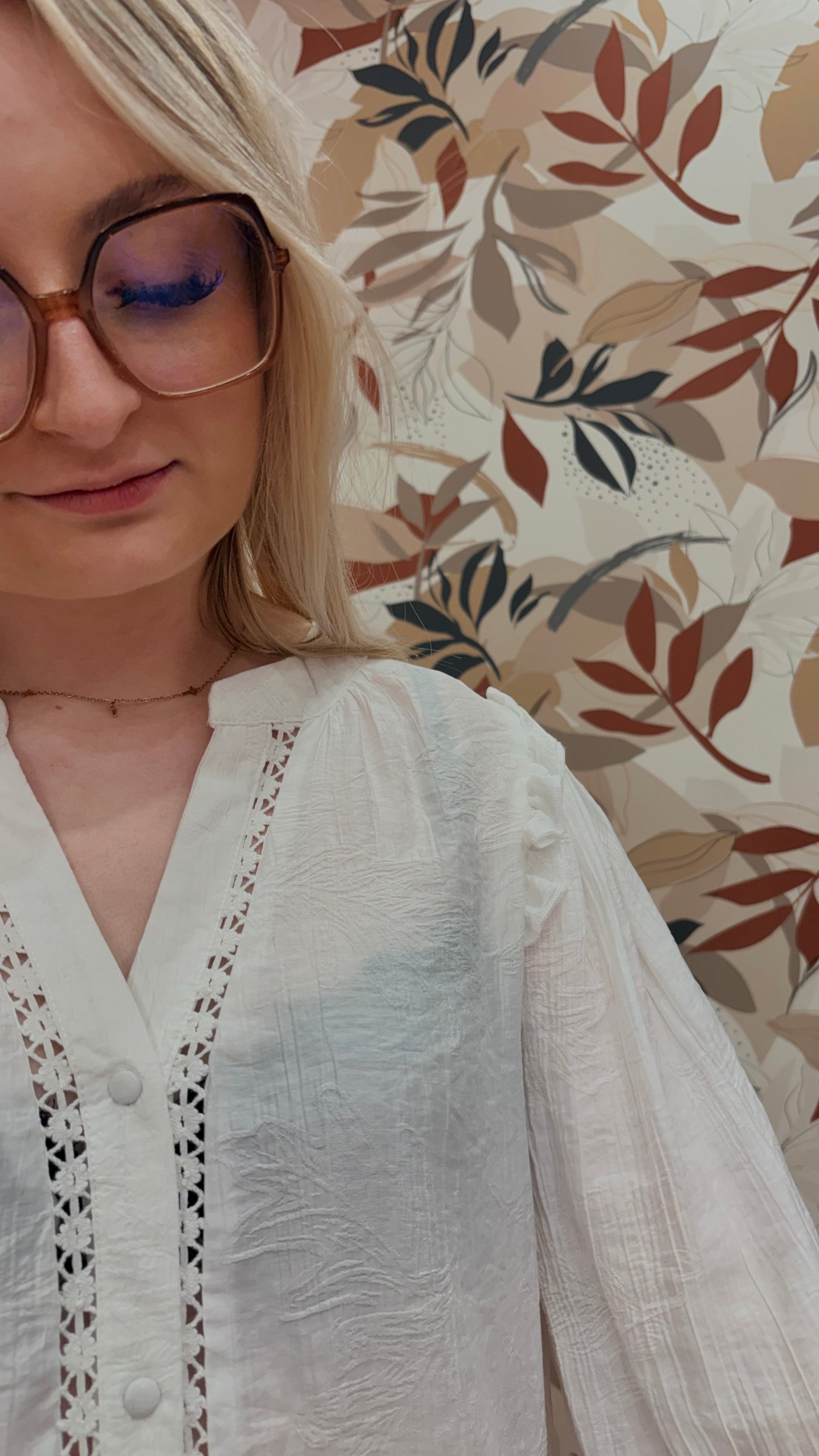 Chemisier blanc élégant avec col V et motifs décoratifs aux épaules, apportant une touche chic et féminine. Léger et confortable, il se porte facilement au quotidien comme pour une tenue plus habillée.