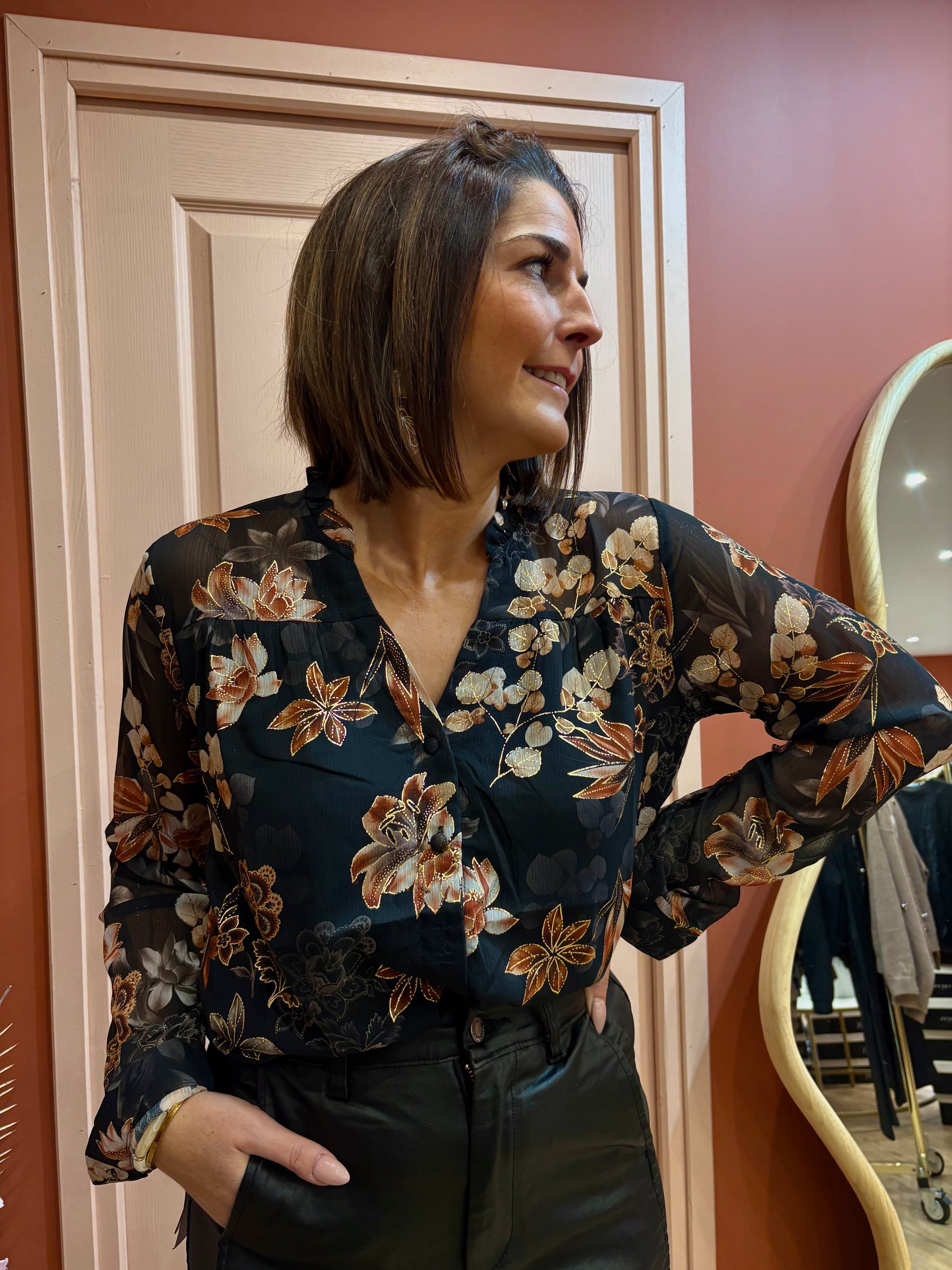 Chemisier tendance aux motifs d’automne, idéal pour apporter une touche élégante et chaleureuse à toutes vos tenues de saison