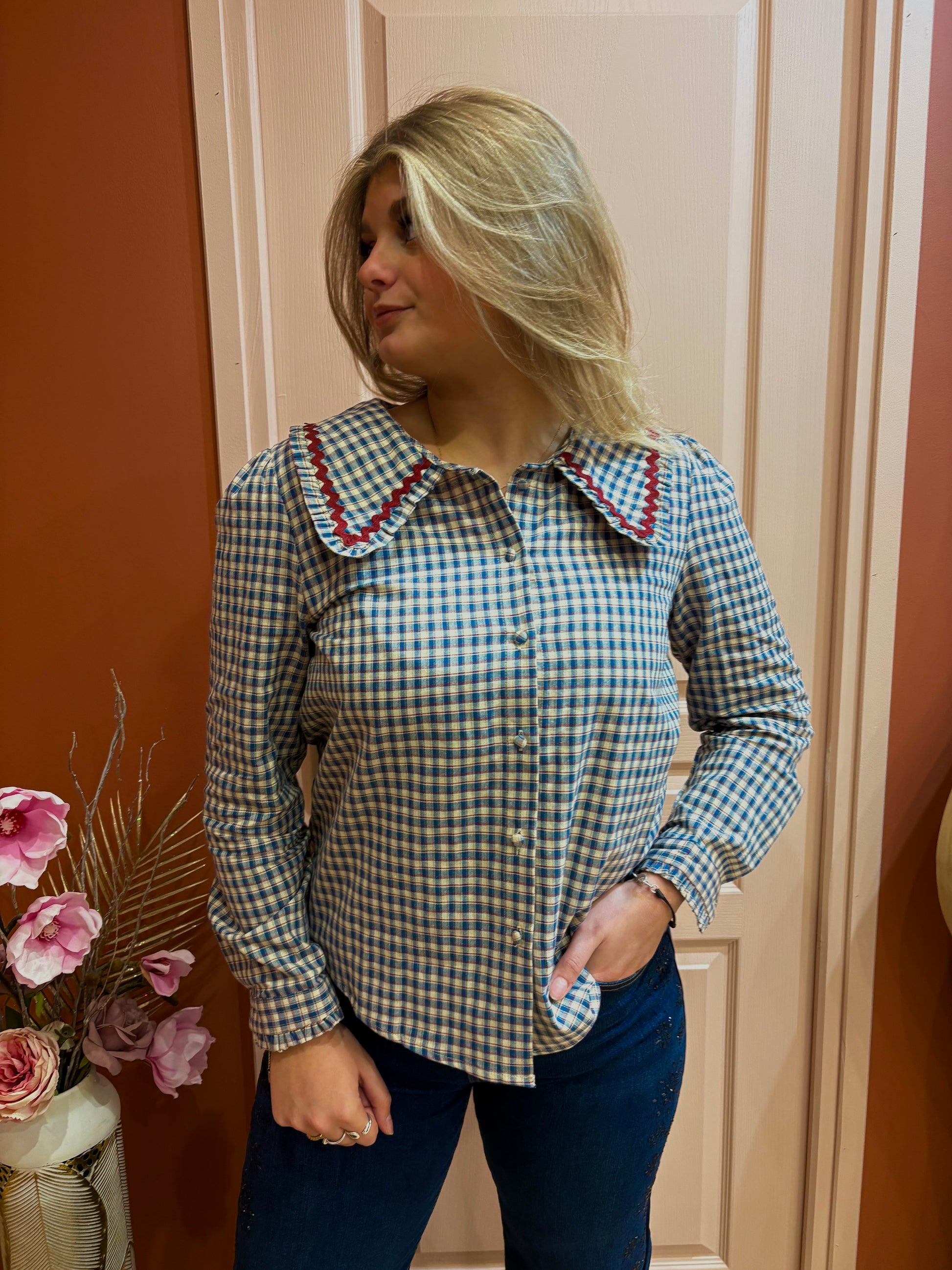 Chemisier à carreaux bleu jean, coupe féminine et tissu léger — l’indispensable casual‑chic de votre dressing