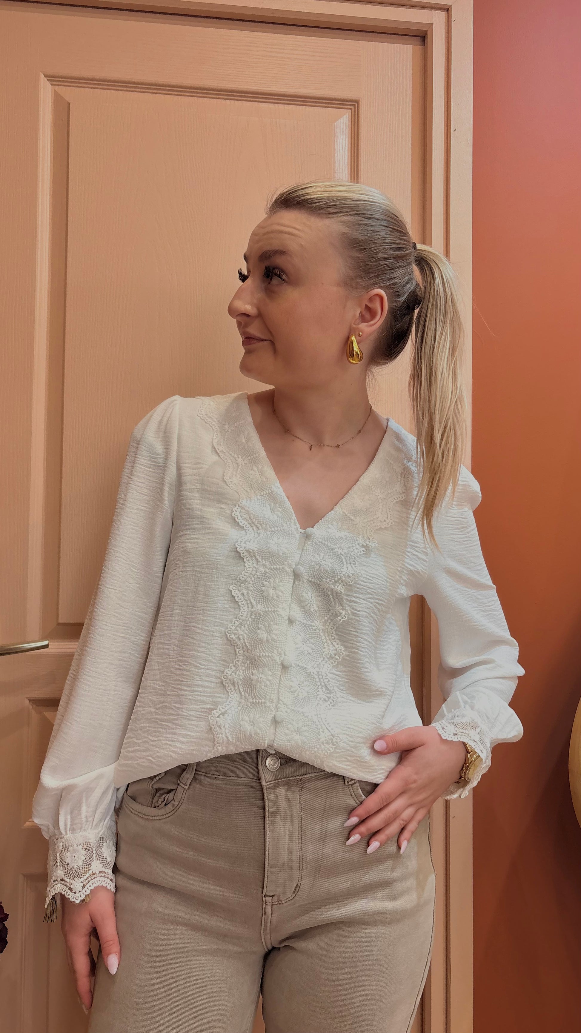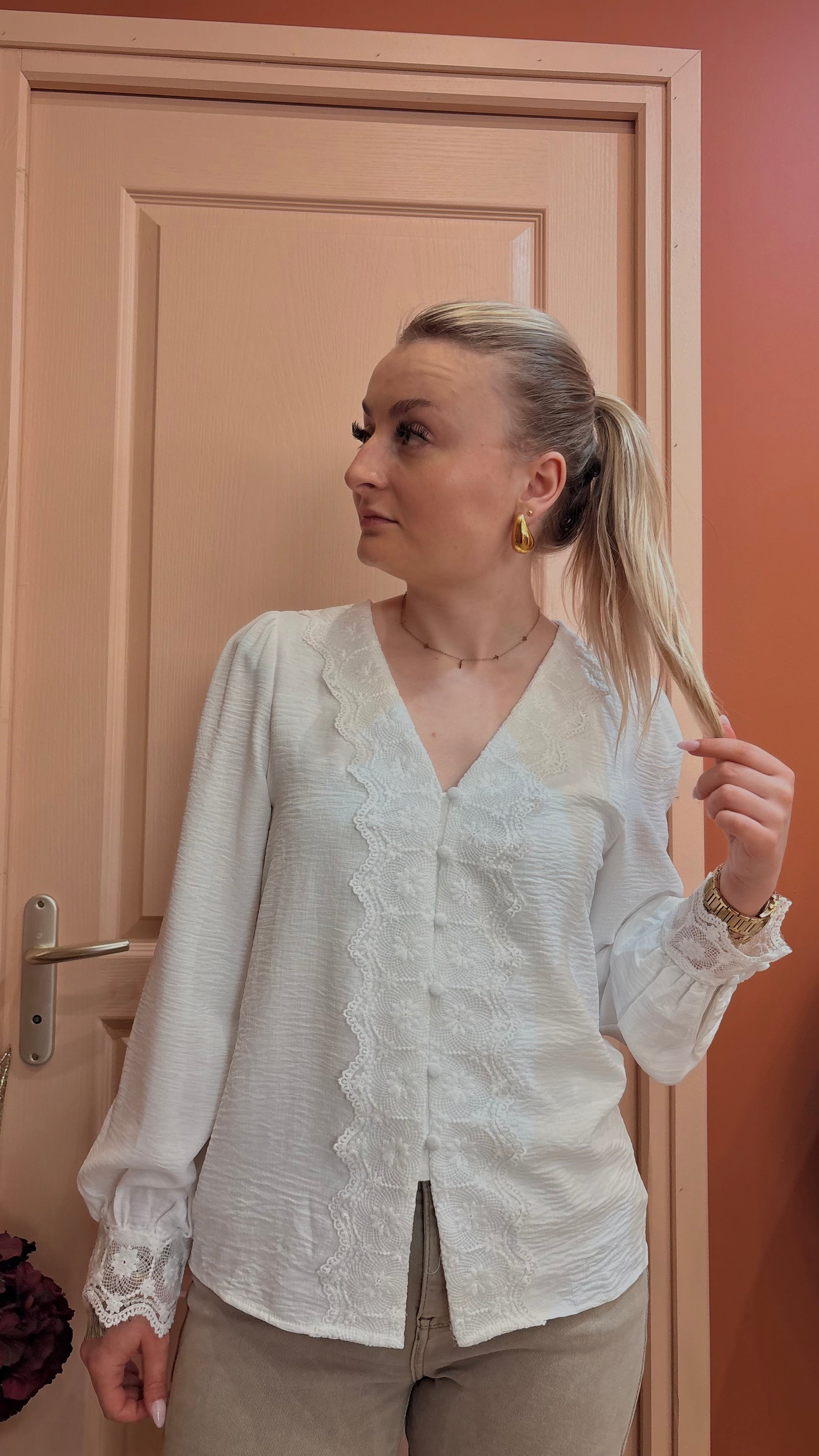 Chemisier blanc élégant avec délicates dentelles au bout des manches, apportant une touche raffinée et féminine. Léger et intemporel, il se porte aussi bien au quotidien que pour une tenue plus habillée. ✨