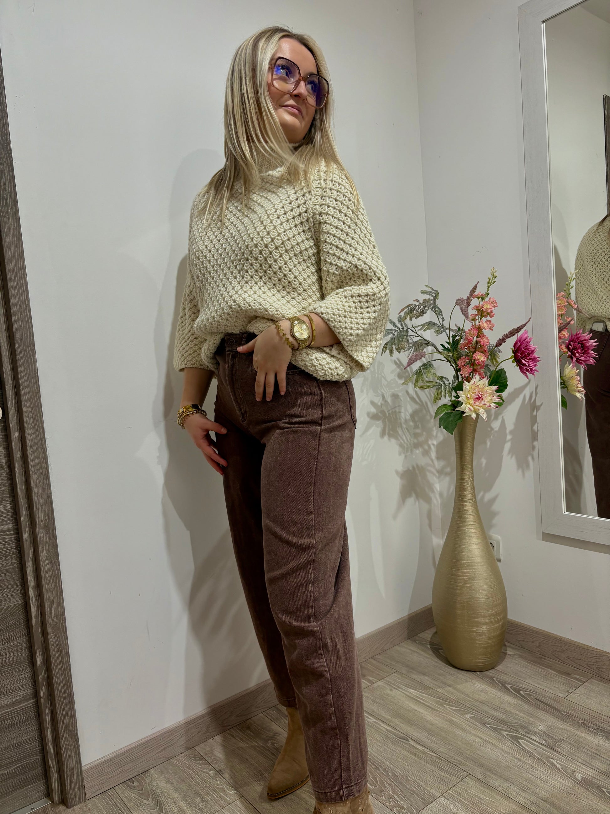 Adoptez un look tendance et affirmé avec notre jean coupe ballon couleur chocolat, la pièce phare de la saison. Conçu pour allier style moderne et confort absolu, ce jean se distingue par sa forme ample au niveau des hanches et sa coupe resserrée à la cheville, créant une silhouette élégante et décontractée à la fois.
