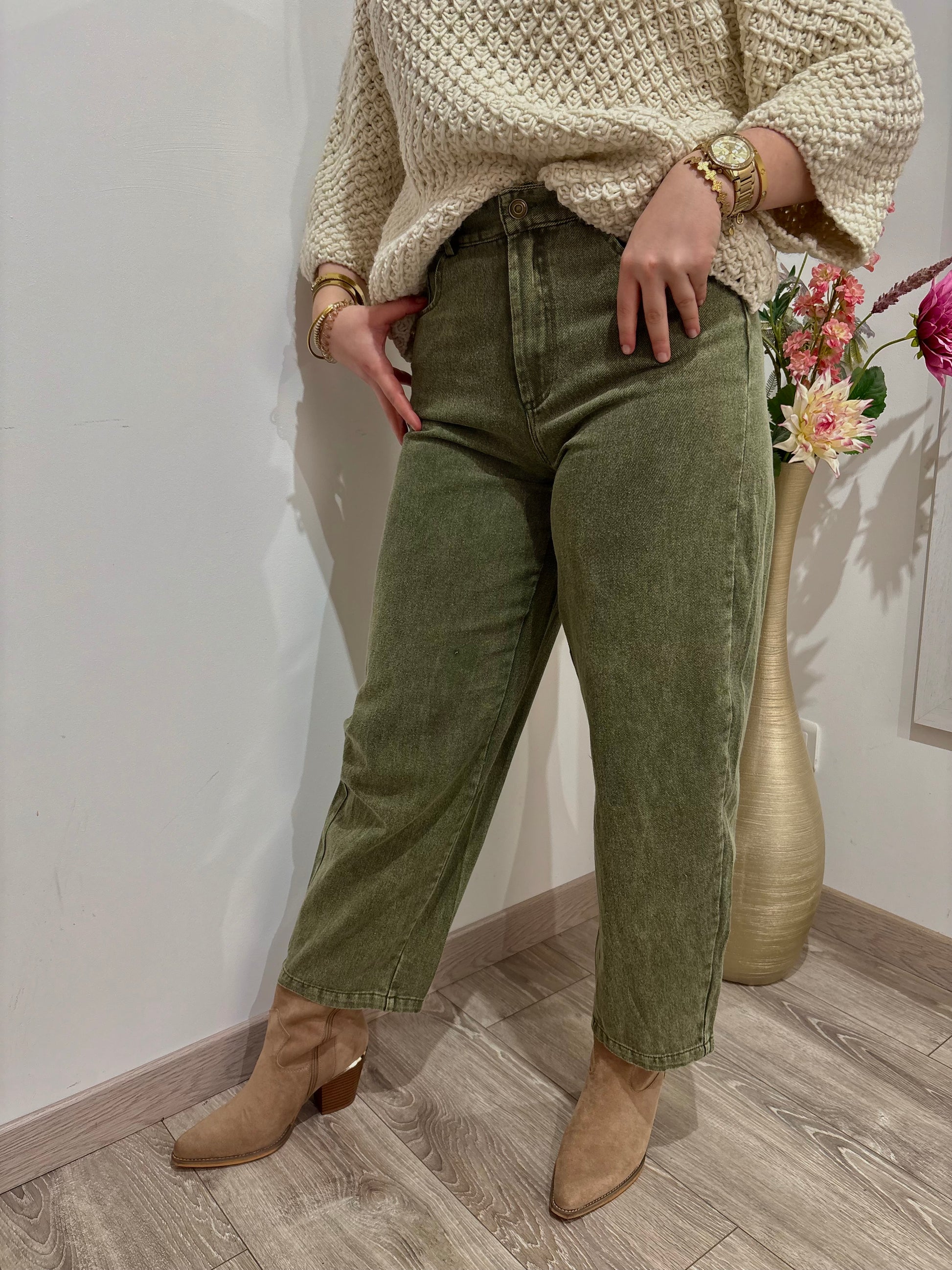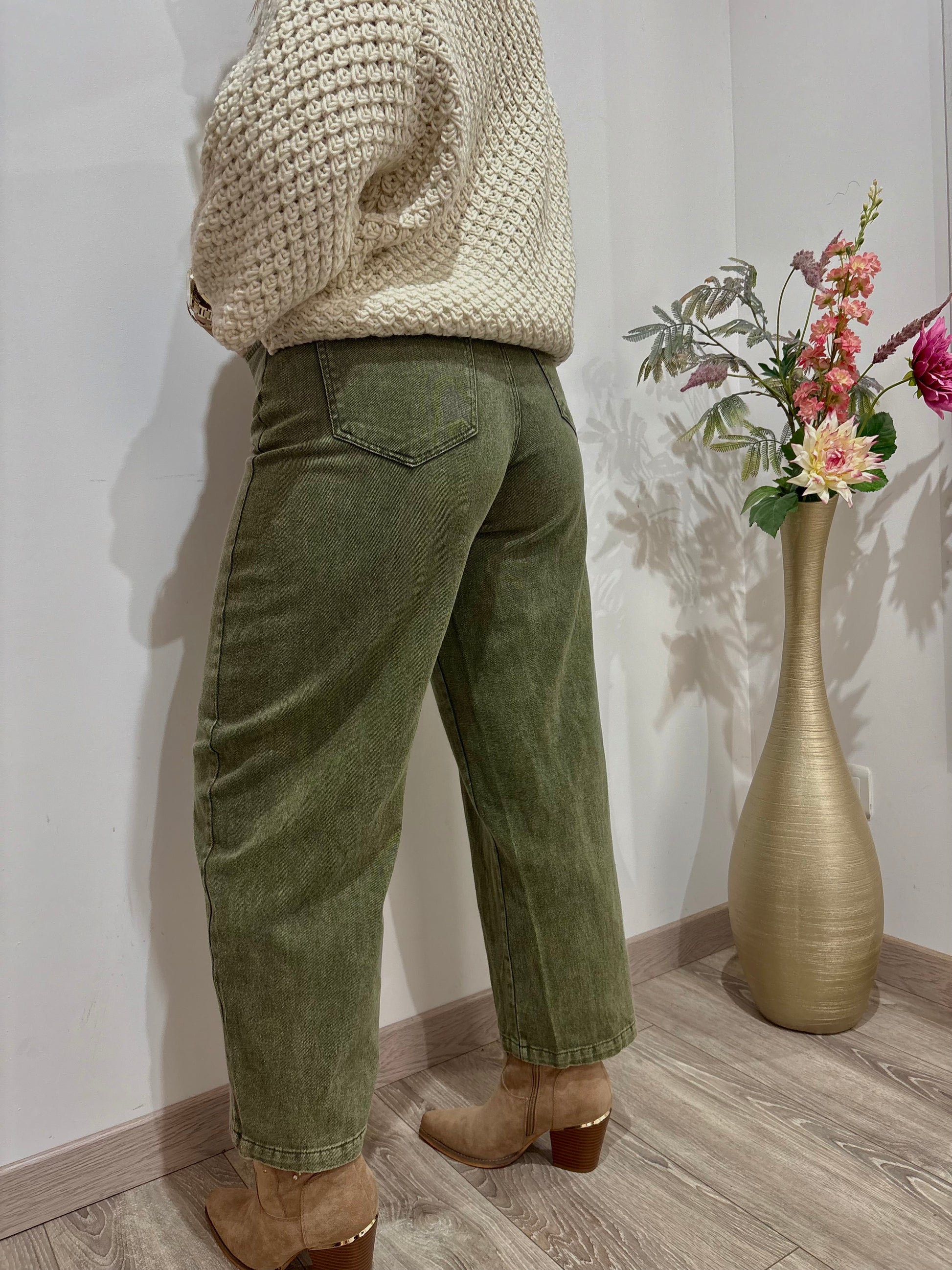 Adoptez un look tendance et affirmé avec notre jean coupe ballon couleur kaki, la pièce phare de la saison. Conçu pour allier style moderne et confort absolu, ce jean se distingue par sa forme ample au niveau des hanches et sa coupe resserrée à la cheville, créant une silhouette élégante et décontractée à la fois.