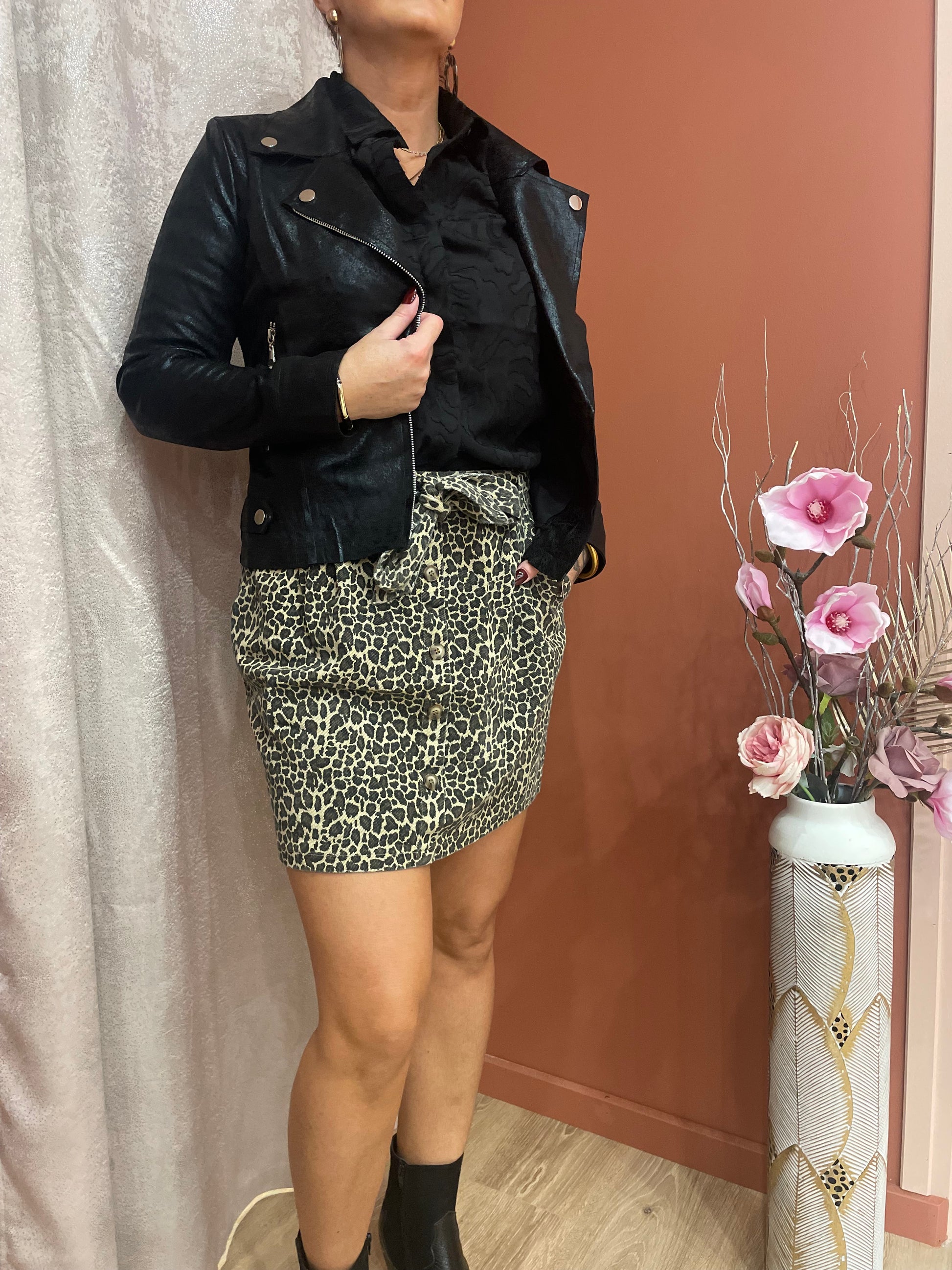 Affirmez votre style avec cette jupe courte à imprimé léopard, un incontournable du dressing féminin.
