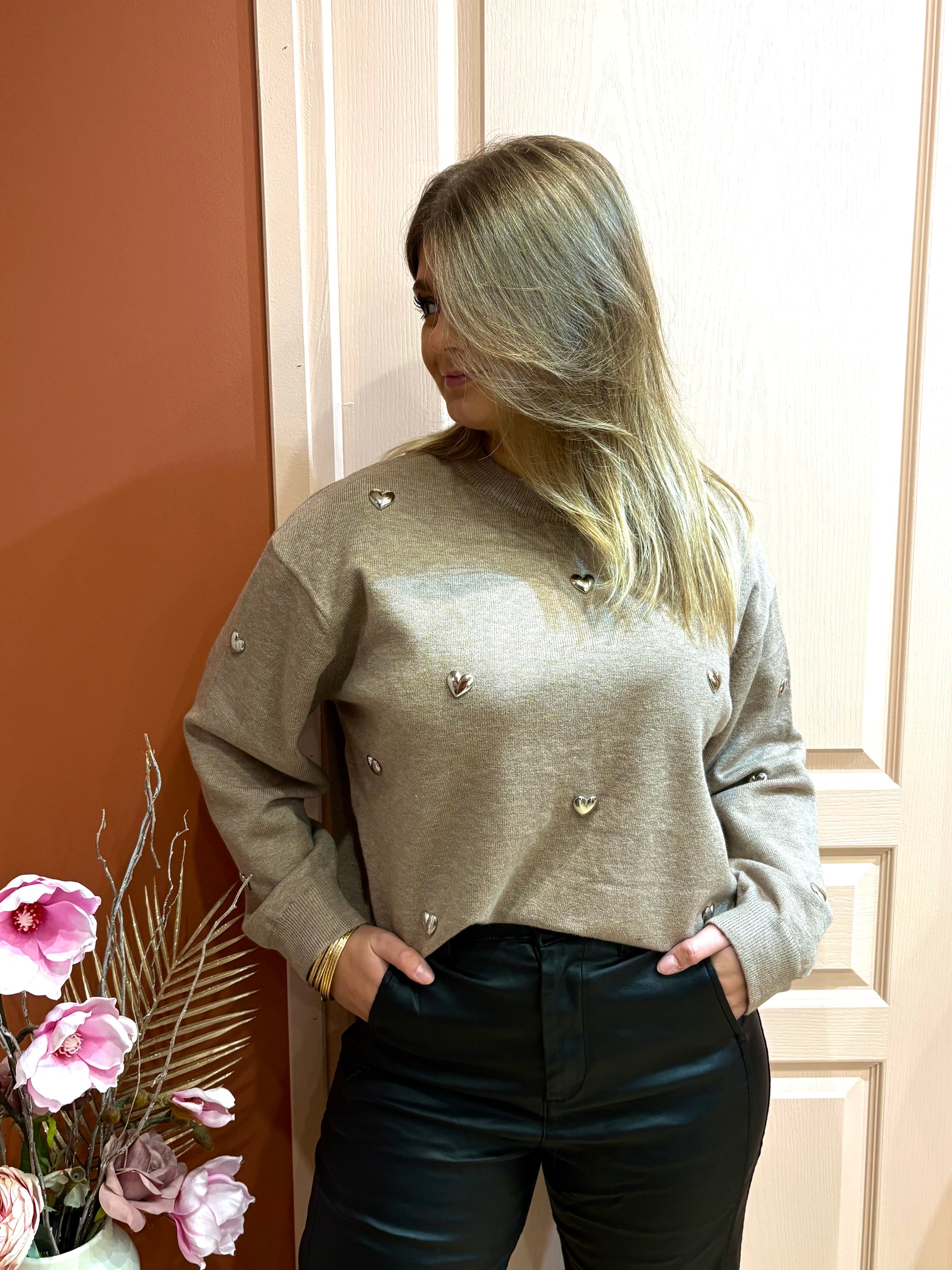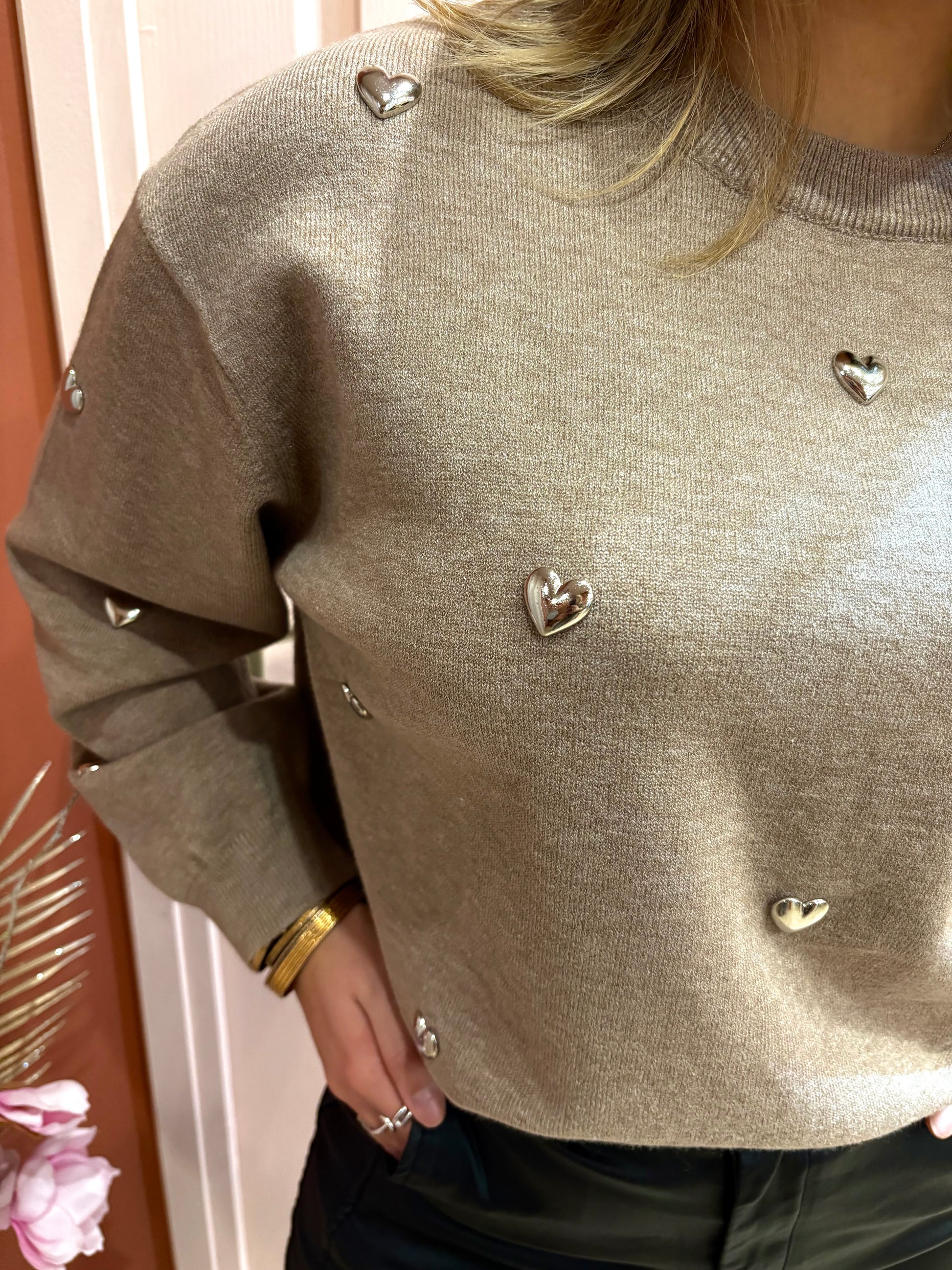 Optez pour un look à la fois tendance et raffiné avec ce pull taupe orné de petits cœurs argentés. Sa couleur taupe, neutre et chaleureuse, s’associe facilement à toutes vos tenues, tandis que les délicats motifs argent apportent une touche lumineuse et féminine. Conçu dans une maille douce et confortable, ce pull est idéal pour accompagner vos journées d’hiver ou de mi-saison.