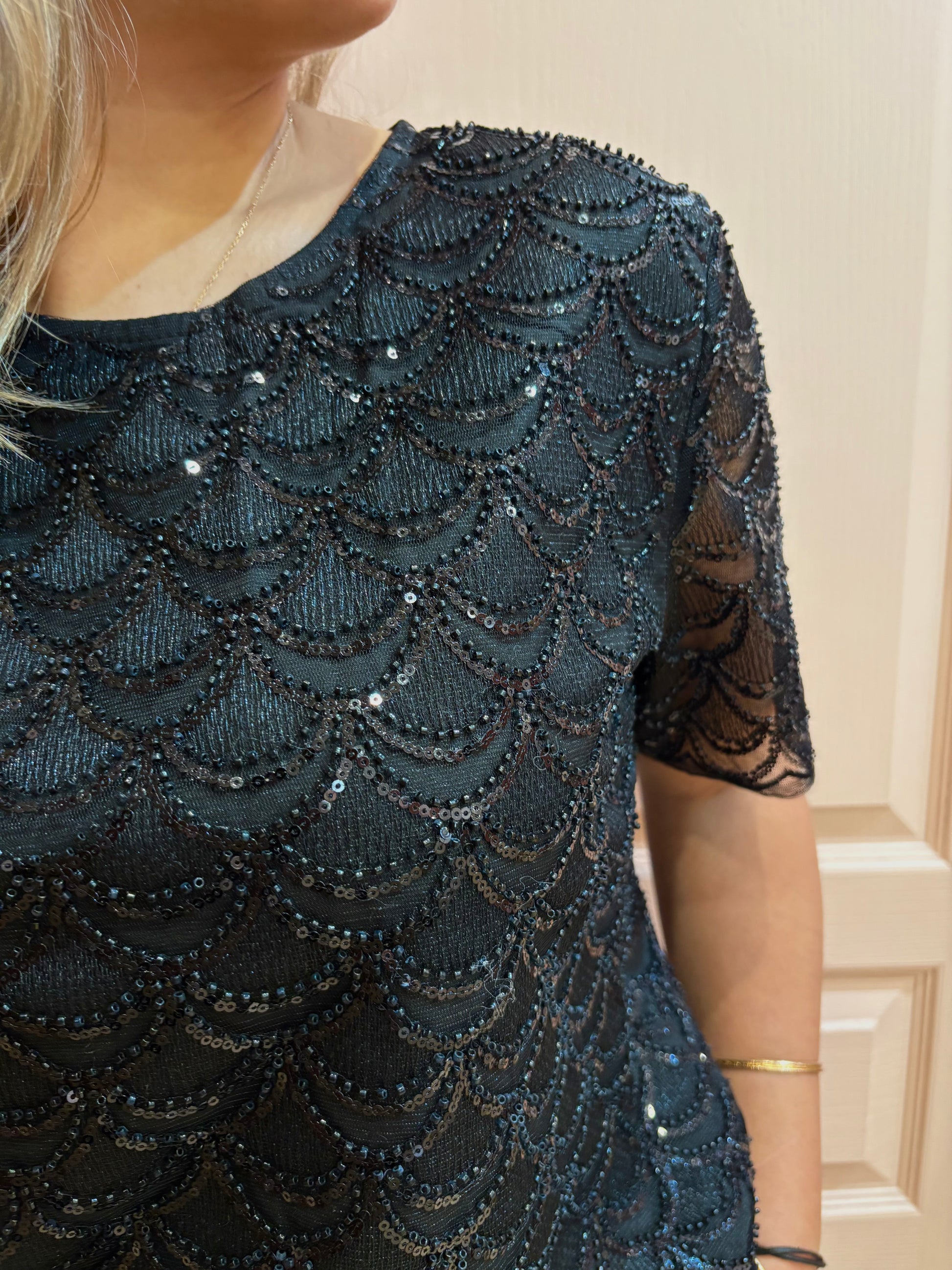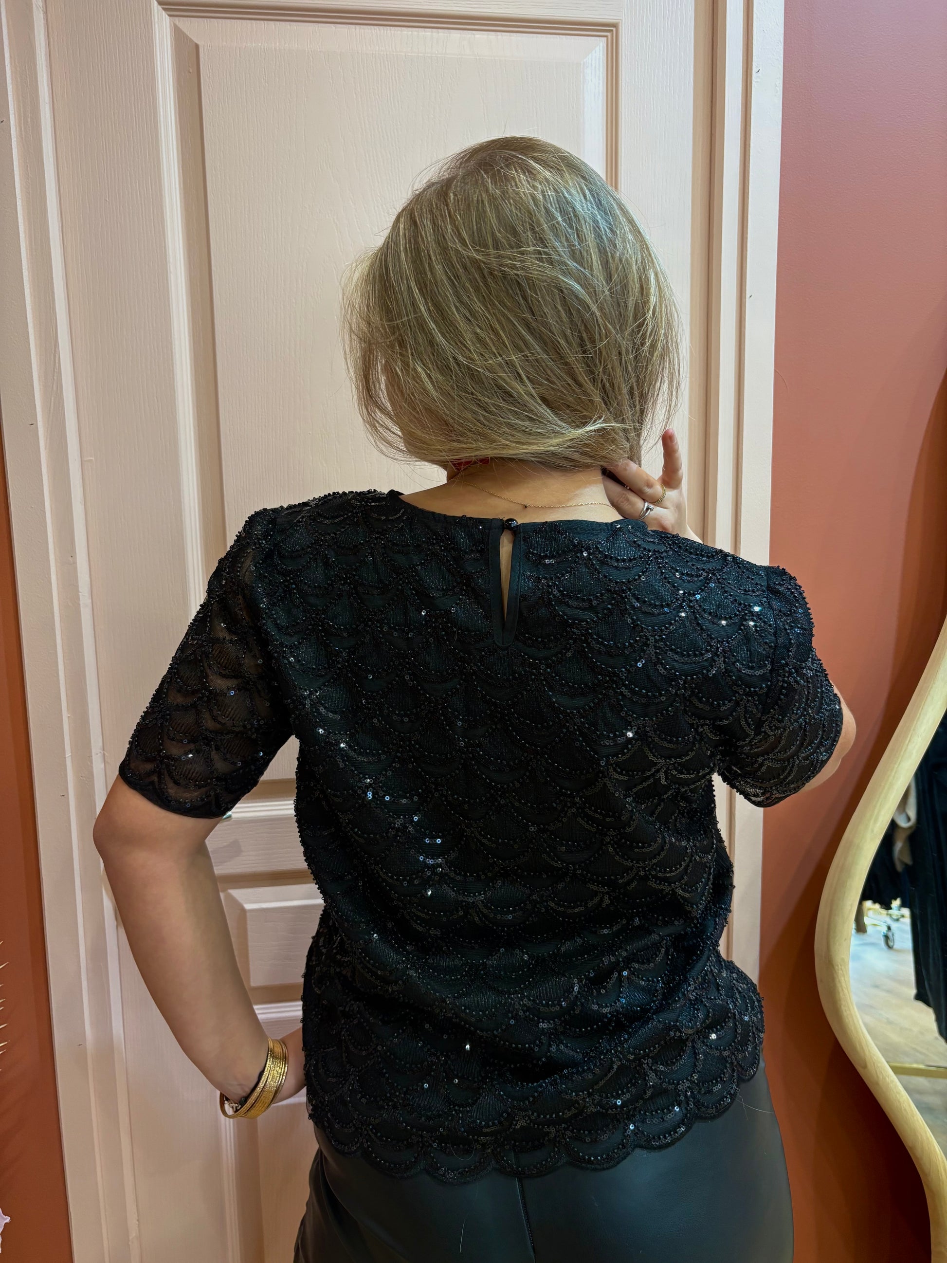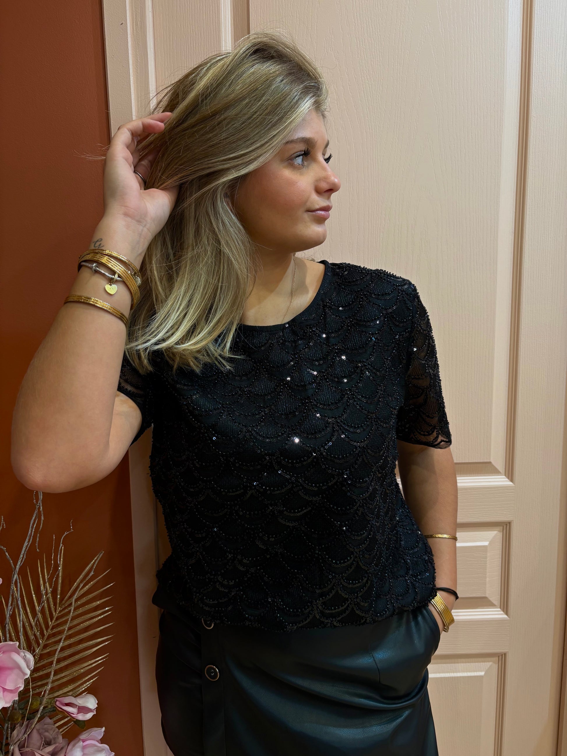 Parfait pour une soirée, un événement habillé ou pour ajouter une note glamour à un look du quotidien, ce top noir à col V doré s’associe facilement avec une jupe élégante, un pantalon tailleur ou un jean slim